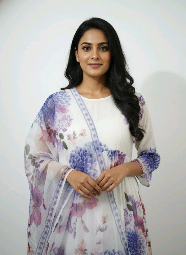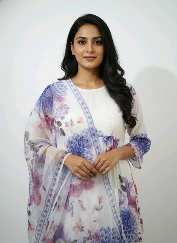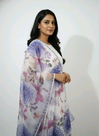 Step into effortless elegance with the J D 131 Floral Printed Umbrella Top With Shawl, exclusively from Thrinaiga Apparels. This stunning ensemble blends chic design with timeless comfort, making it a must-have for any fashion-forward wardrobe. Its floral print in delicate white and violet hues exudes sophistication, while its versatile shawl adds a touch of flair and functionality for any occasion.