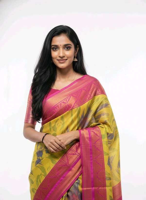 Shining Star Floral Printed Rose & Canary Yellow Chiffon Saree - A Perfect Blend of Elegance and Style